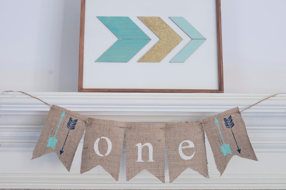 Tribal Party Decor. A stunning Tribal Be Brave Little One Banner, perfect for that Aztec theme 1st birthday party. Bright white lettering on burlap along with arrows on the ends. Perfect as a Highchair or Smash Cake photo prop.