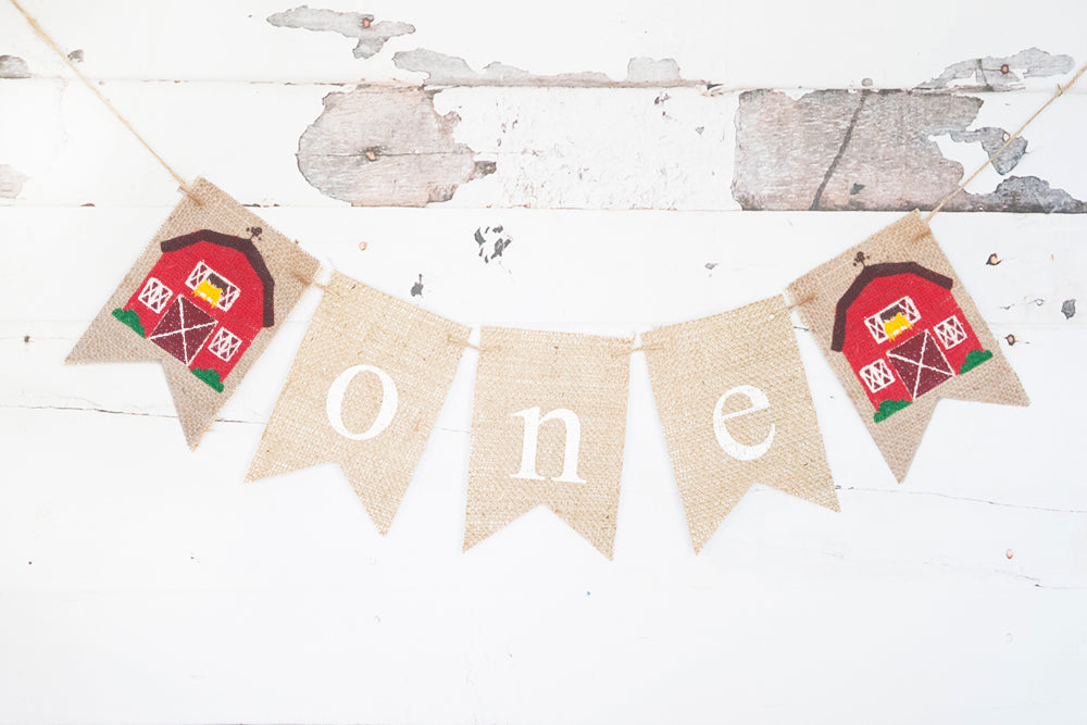 Farm party decor. Kick up your heels, we've got the perfect farm first birthday party banner, perfect for your barnyard bash. A rustic red barn with a hay loft is stenciled onto burlap with the word "one" in between. Great for a farm first birthday party!