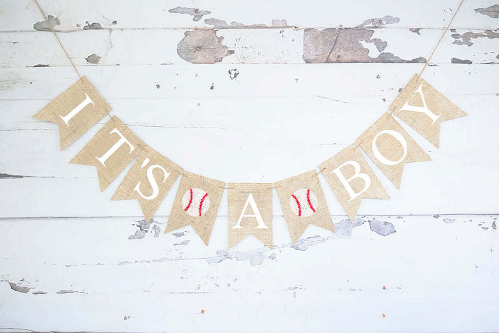Baseball baby shower decoration. Baseball pregnancy announcement. Hit a home run with this baby boy shower banner. Perfect for a baseball theme, this It's a boy burlap banner will look gorgeous at your gender reveal hung above a table.