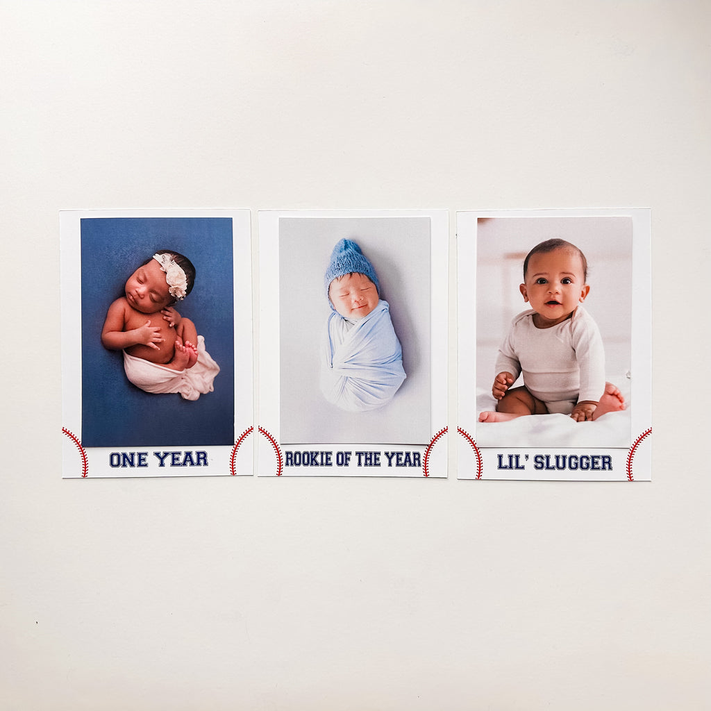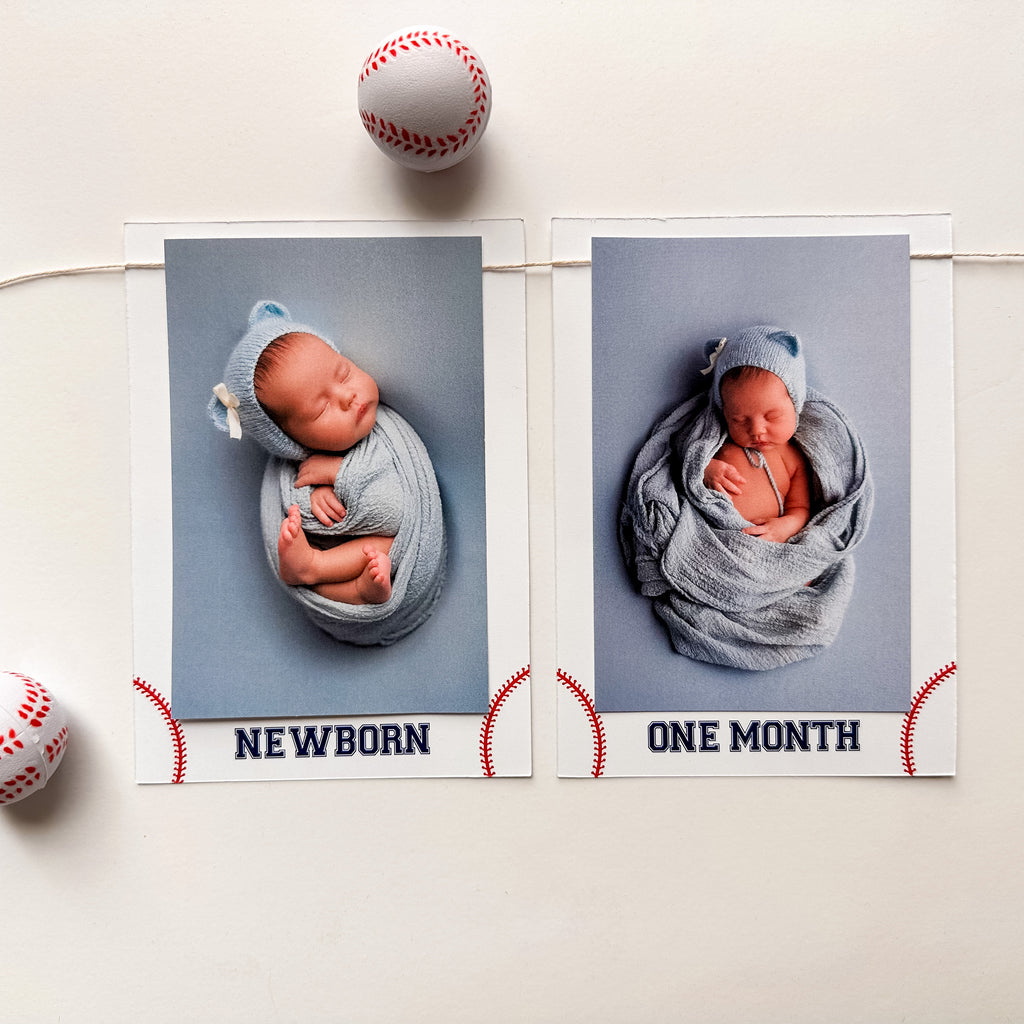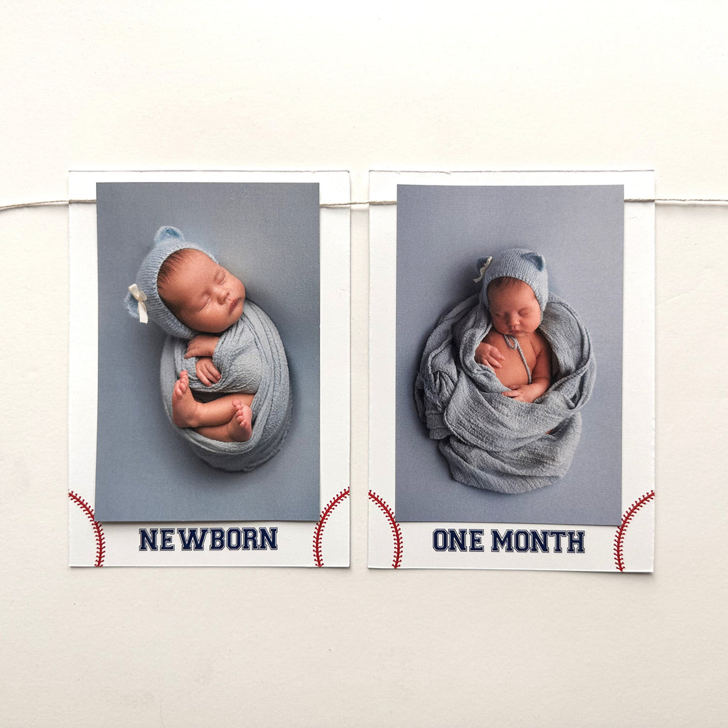 This Baseball First Birthday Photo Banner will make your baby's 1st birthday party a hit! Add your own 4x6 pictures to feature your little slugger on this monthly milestone garland starting from age newborn all the way through 12 months. Design includes a white background with red baseball strings, and the words in a navy font. A free bonus "One Year" card as well as two bonus baseball theme cards will come with your banner to show off even more cute pictures of your baseball baby.