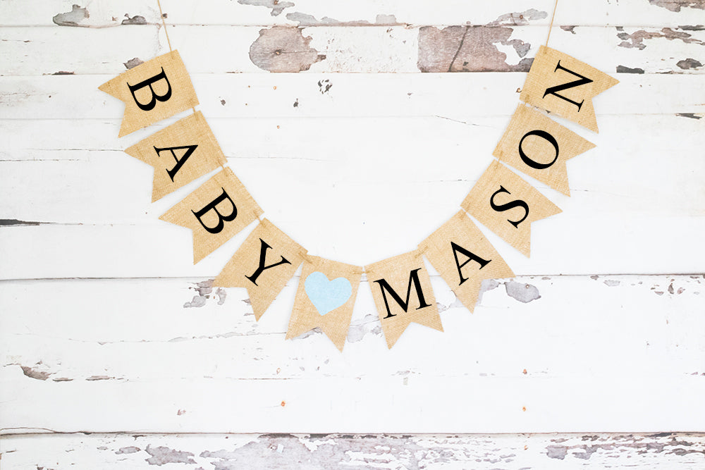 Boy baby shower decoration, Gender reveal banner. Customized just for your little baby boy. This burlap banner features a delicate baby blue heart and can be personalized with your name or your baby's name. Add your name to the notes during checkout. Count out the letters of the name only and use the drop-down menu on the right to select the quantity.