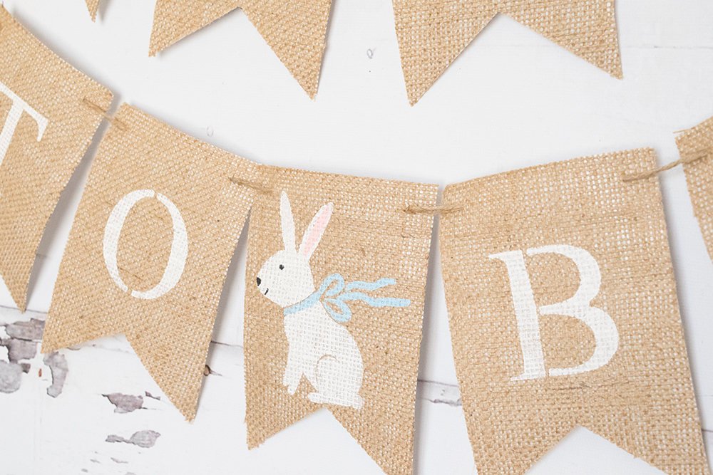 Easter baby shower decoration. A little bunny is on its way so decorate your baby shower with this adorable bunny baby shower banner. Perfect for an Easter gender reveal party. The ribbon around the bunny rabbit's neck can be painted blue or pink.