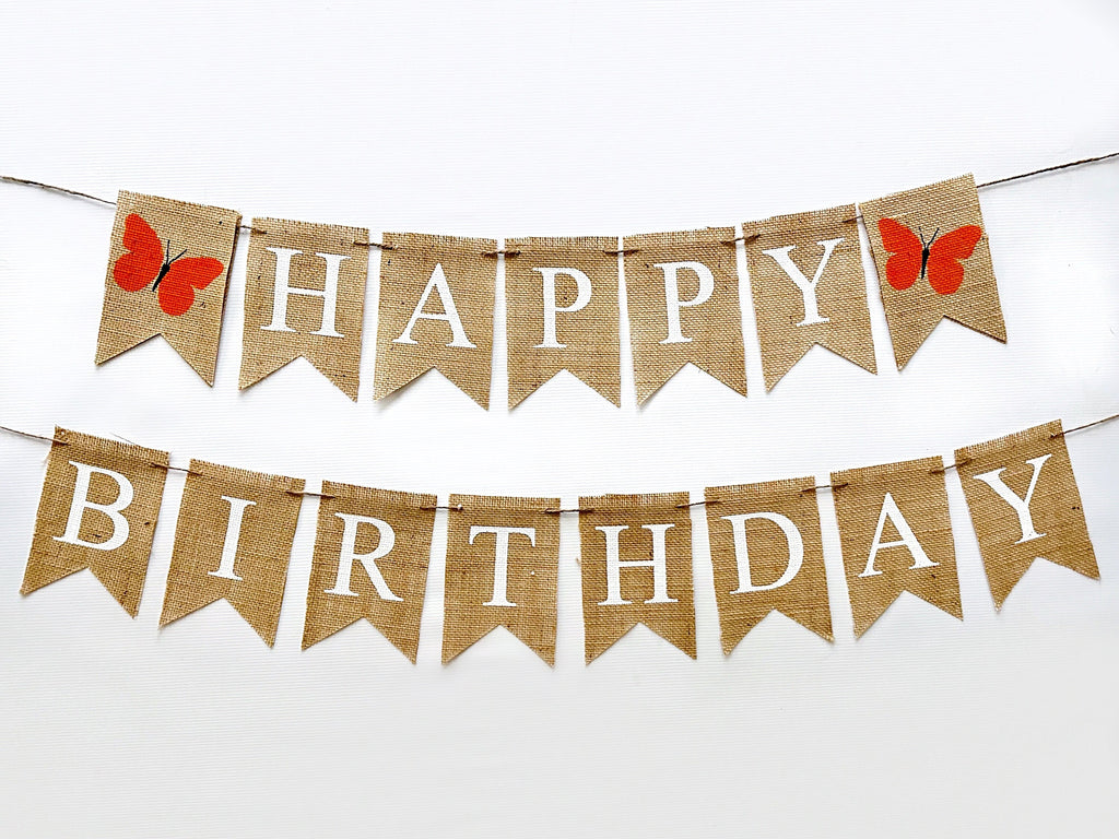 Butterfly birthday party decorations. A fun butterfly party decoration featuring bright orange butterflies. This banner fits into any spring or garden themed birthday party with the words Happy Birthday stenciled in white.