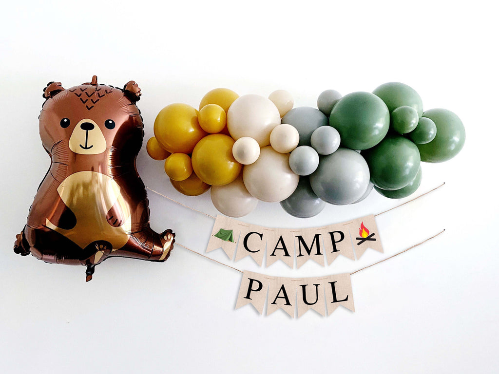 An adorable Camping party decoration with a CARD STOCK banner with the words camp and your custom wording. This full kit also includes a fun bear foil balloon along with a balloon garland in woodland colors grey, beige, green, and mustard. This fun camping themed party collection is great for a camp birthday, camping trip, or cookout. Purchase individual pieces or the full set.