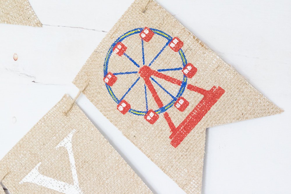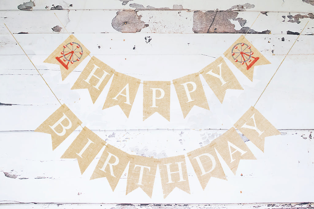 Carnival birthday party decoration. Bring on the fun with this Happy Birthday banner featuring Ferris wheels for that exciting circus party. A great addition to a carnival-themed party.