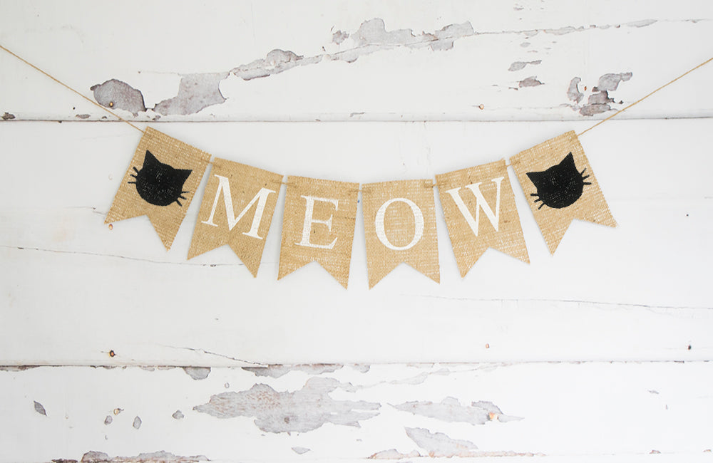 Cat party decor. A cat banner with the words Meow and two black cats on either end. Perfect for a cat party, or for a cat lover. This Meow banner makes a great gift.
