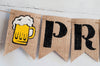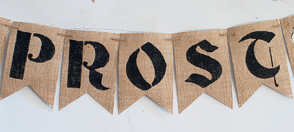 Oktoberfest banner. A gorgeous cheers banner perfect for a beer festival, beer fest, Oktoberfest decoration or just to hang by your bar. The German word Prost is stenciled in black and 2 jugs of beer are stenciled at the beginning and end. Cheers to life and living your dreams.