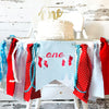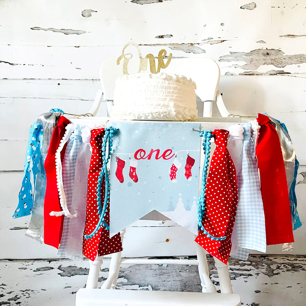 FINAL SALE! The best Christmas present is your little one. Celebrate their 1st birthday with this fun Christmas stocking high chair banner. This Christmas 1st birthday party decoration in red and light blue with fun corresponding trim.