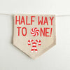 This Christmas half birthday party high chair banner is the perfect holiday decoration to celebrate a 6 month birthday. The words "Halfway to One" in red with a peppermint O and two cross candy canes make this flag a classic for their half year celebration. Banner includes 6 tassels in green, white and red separated by wooden beads. Hang on a high chair or above the cake table and when the party is over hang on the wall as part of a room decoration. This Christmas cake smash sign makes an awesome photo prop and keepsake.