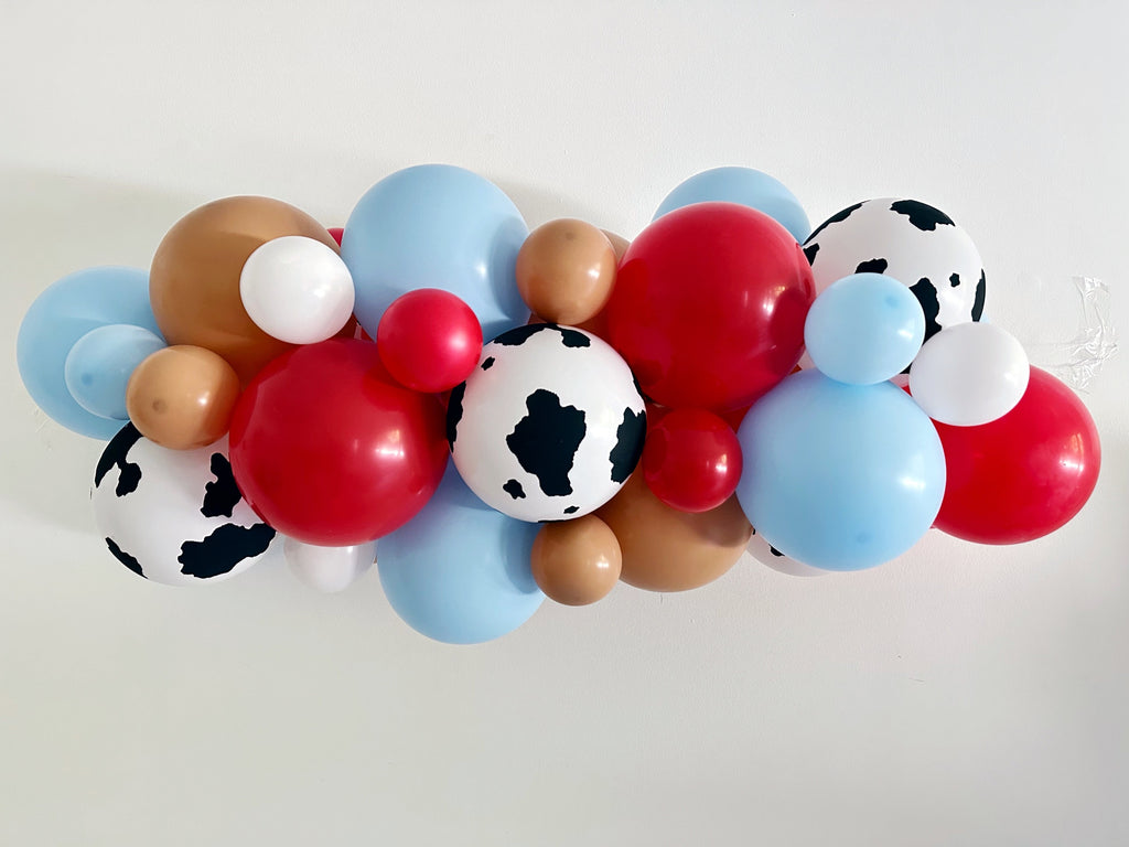 Come join the barnyard fun with this cow themed second birthday collection. In bright shades of red, blue, brown and white this stunning cow balloon garland is the perfect backdrop to your event. With the Moo Moo I'm Two birthday banner, this whole set is perfect for your farm party. Celebrate with this fun kit.