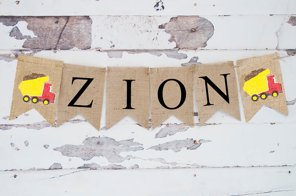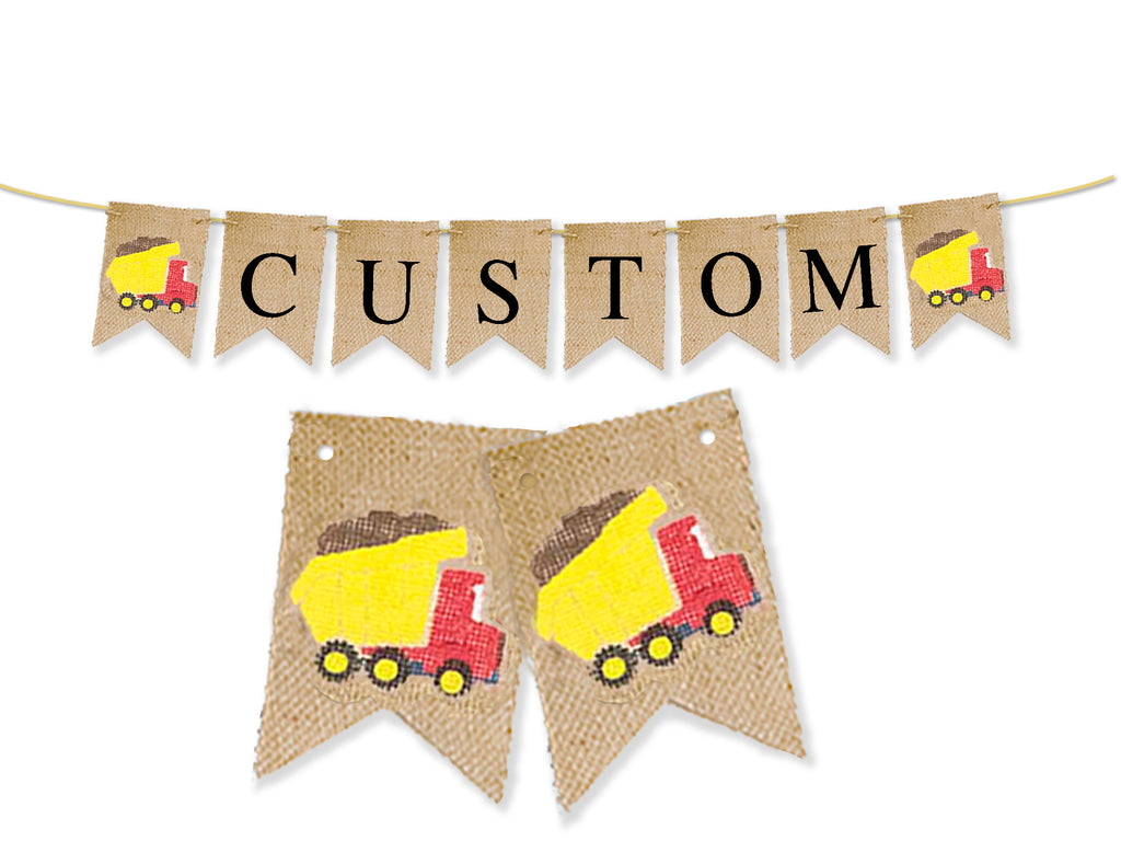 Custom Construction birthday party decoration. Perfect for a dump truck party as two yellow and red dump trucks are at the beginning and end of this custom banner. Personalize this banner with the custom wording of your choice. Just use the drop-down menu on the right to select the number of letters you will need for the name only.