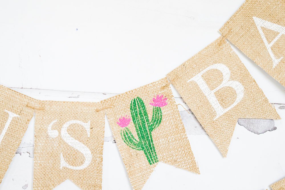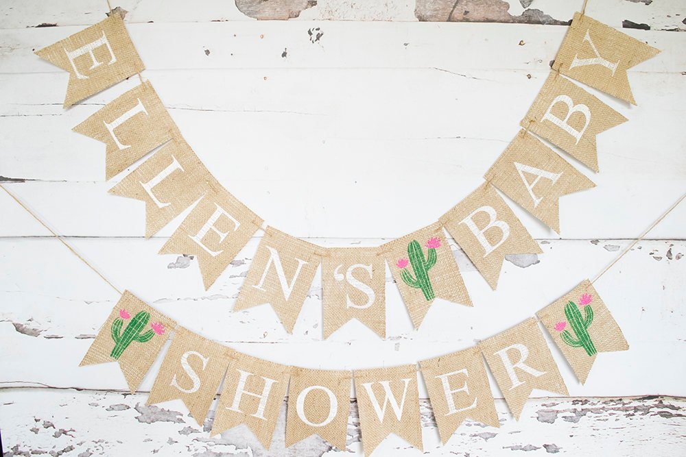 Fiesta Baby Shower Decoration. This fun cactus baby shower banner can be personalized with the guest of honor's name. Perfect for a Mexican-themed party, this festive banner with flowering cacti is stunning. Include the name on the notes to the seller when checking out. Count out the letters of the name only and use the drop-down menu on the right to select the quantity.