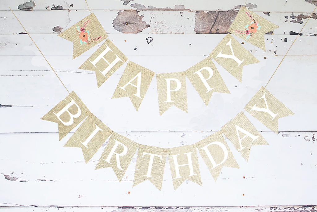 Boho birthday decorations, Floral birthday party decor. A stunning Floral Happy Birthday Banner. Give the gift of flowers with this one of a kind floral party decor. Delicate flowers are hand-painted on burlap flags in coral, mint, rose and a hint of yellow to create a delicate floral bouquet.