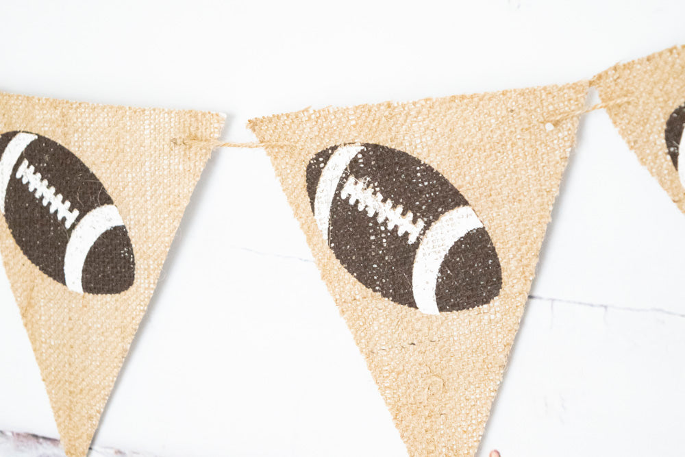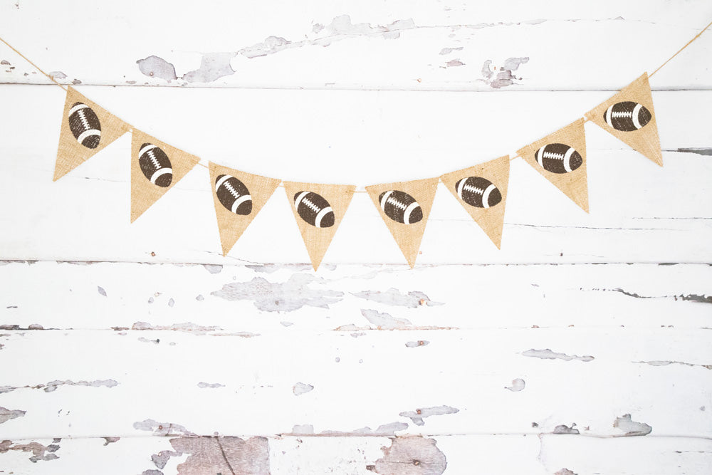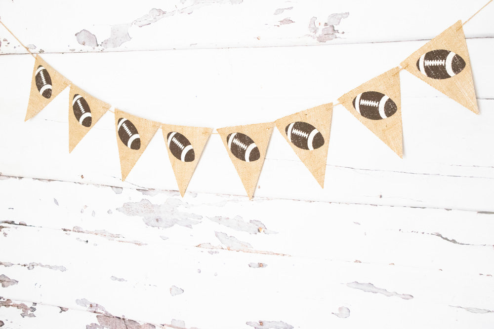 Football Party Decor. Score a touchdown with this football banner, perfect for your next football party. You get the hot dogs and popcorn and we'll make the decorations. This football banner with hand-painted footballs is the perfect decoration for a football birthday party. Use it for a Superbowl party, sports party, or for the next game night.