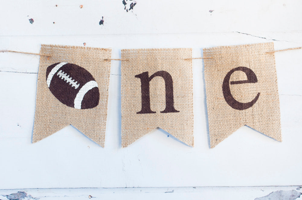 Football Party Decor. Is your little footballer turning one? Celebrate that first football birthday with this stunning Football Banner. Stenciled in brown with a football instead of the O. Perfect for that Football Highchair, Football Smash Cake photo.