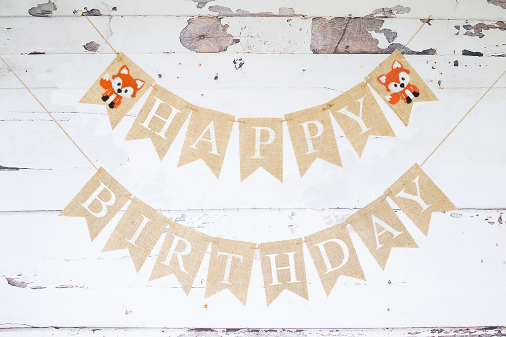 Woodland birthday party decorations. A fun woodland party decoration featuring bright orange foxes. This banner fits into any woodland-themed birthday party with the words Happy Birthday stenciled in white.