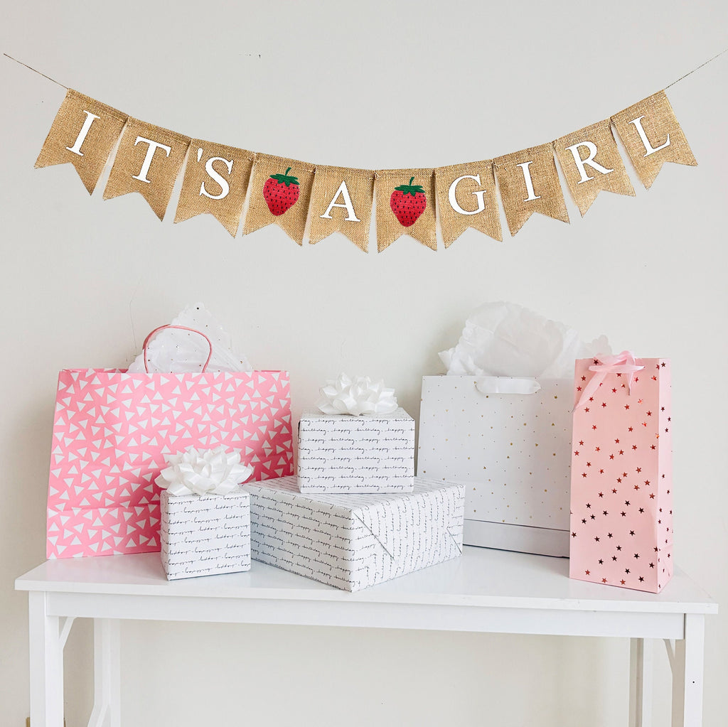 Celebrate your sweet baby girl with our Strawberry Baby Shower sign. Welcome her to the world at a strawberry themed baby shower or gender reveal. Select from our collection of Strawberry baby shower banners announcing It's a girl. Each decoration features gorgeous, hand-painted strawberries, making every piece a one-of-a-kind work of art that can be hung in the baby's nursery after the announcement.