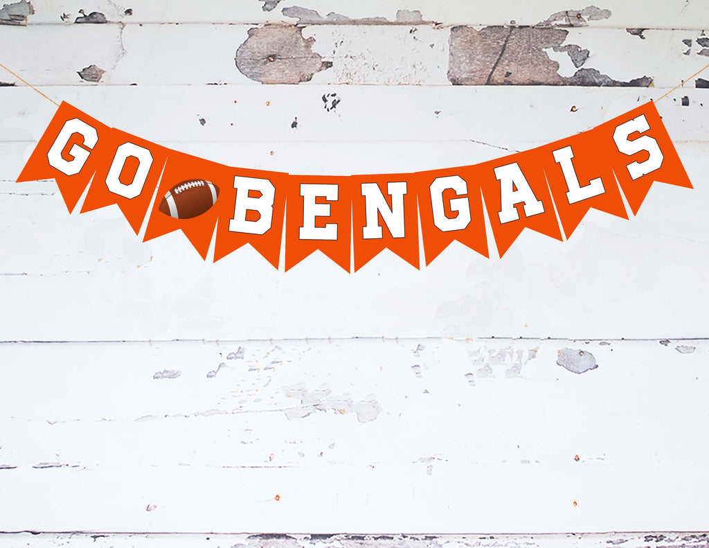 Football Party Decor. It's Game Day, score a touchdown with this Bengals football banner, perfect for your football party. You invite the guests and we'll make the decorations. This cardstock banner with the Bengals colors makes the perfect football decor.