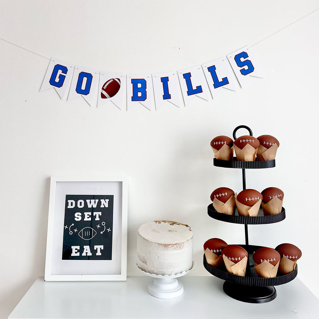 Football Party Decor. It's Game Day, score a touchdown with this Bills football banner, perfect for your football party. You invite the guests and we'll make the decorations. This cardstock banner with the Bills colors makes the perfect football decor.