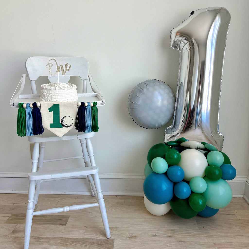 For your Golf Loving baby who is turning one, this first birthday balloon tower is the perfect decor to celebrate a milestone birthday. A silver one and golf ball shaped balloon topping a green, blue and off white latex balloon tower makes this a classic for their first celebration.