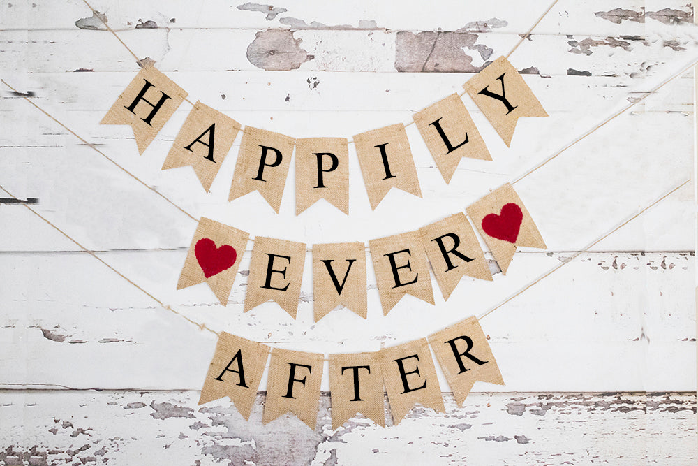 Wedding Decorations. Engagement Party Decor. This beautiful Happily Ever After banner is a perfect wedding decoration. Show your friends and family your fairy tale is complete. This banner features black lettering and bright red hearts.