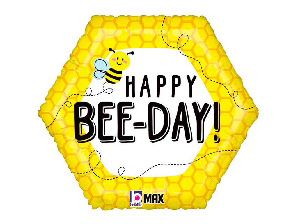 An 18" Happy Bee Day Balloon. This Happy Bee Day decoration is perfect for a bumblebee birthday party. Large enough as a photo prop for a bumblebee themed party
