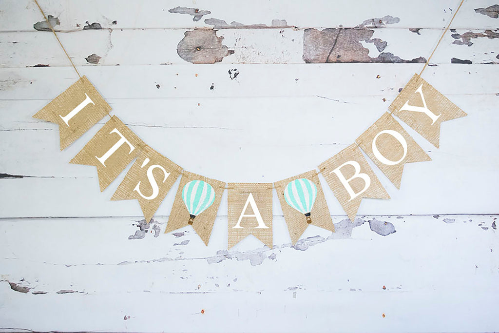 Hot Air Balloon baby shower decoration. Hot air balloon pregnancy announcement. Up, up and away for this baby boy shower banner. Perfect for a hot air balloon theme, this It's a boy burlap banner that will look gorgeous at your gender reveal hung above a table.