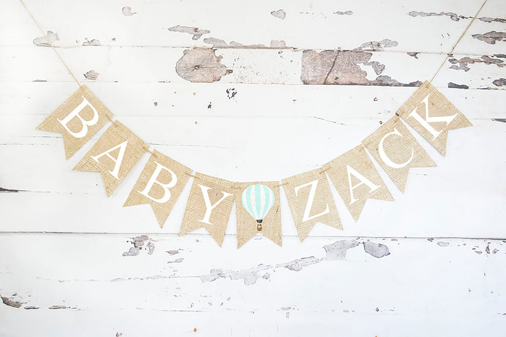 Hot air balloon baby shower banner, Up Up and Away Baby Shower Decor. Great for an adventure-themed baby shower this hot air balloon banner. Personalize this banner with the name of your choice. Just use the drop-down menu on the right to select the number of letters you will need for the name only.
