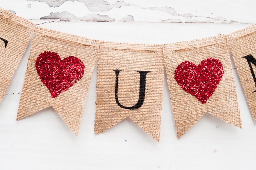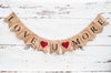 Wedding Decoration. A gorgeous vibrant wedding or engagement banner for people who are in love. The vivid red hearts are literally jumping out. This handcrafted burlap banner is secured so the edges don't fray. The words Love You More are stenciled in black and with red glitter hearts.