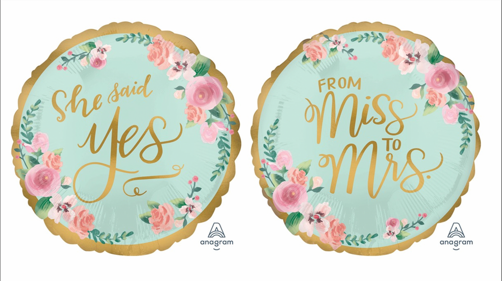 A two sided balloon saying Miss to Mrs and She Said Yes. This balloon is perfect for any engagement or bachelorette celebration, engagement photo prop, bachelorette party or bridal shower. It measures 18 inches and is great for your party decor.