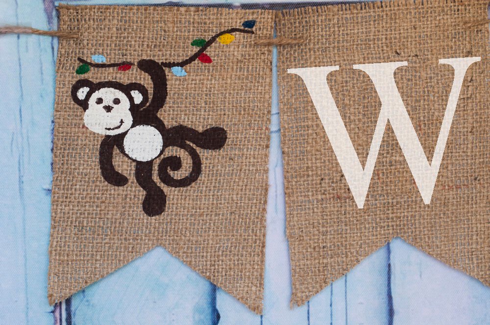 Monkey Baby Shower Decoration, Jungle gender reveal party. Welcome your little baby monkey with this cute safari-themed baby shower decoration. This baby monkey banner is perfect for a boy or girl gender reveal party. Add your family name or your precious little one's name to this custom banner. Include your personalized wording in the notes when checking out. Count out the letters in your name and then select from the drop-down menu to the right.