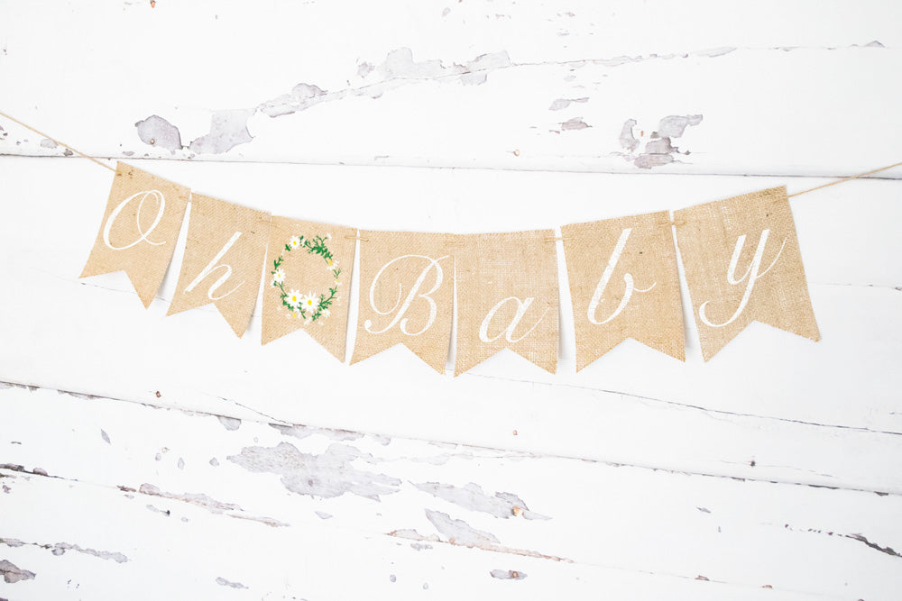 This floral Baby Shower banner with the words Oh Baby painted in white with feathers in between is great for a floral or rustic-themed shower and can also be used as nursery decor after the party.