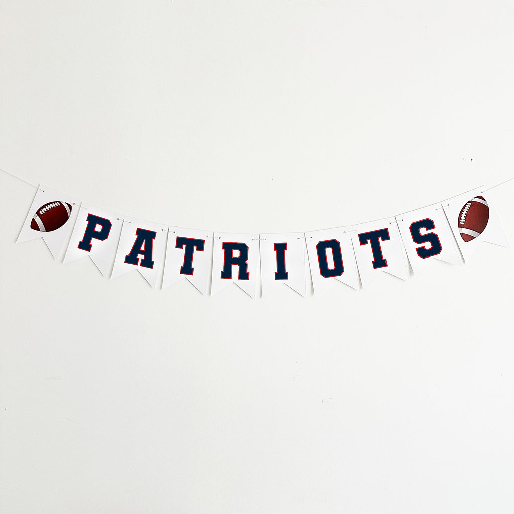 Football Party Decor. It's Game Day, score a touchdown with this Patriots football banner, perfect for your football party. You invite the guests and we'll make the decorations. This cardstock banner with the Patriots colors makes the perfect football decor.