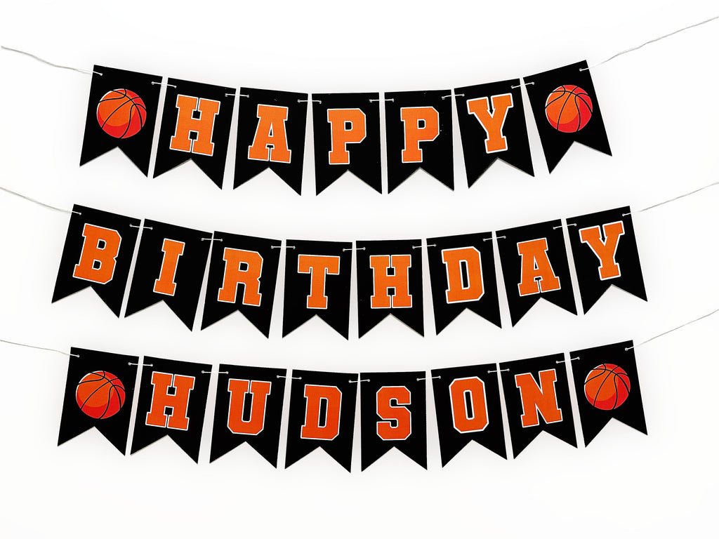 Basketball Birthday Decor. Slam dunk your party decorations with this cute "happy birthday" banner. This banner features bold orange lettering set against black flags and is sure to compliment basketball your party decorations. Personalize this banner with the name of your choice. Just use the drop down menu on the right to select the number of letters you will need for the name only.