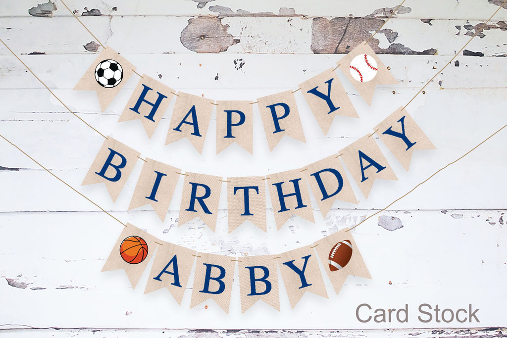 Sports Birthday Decor. Throw a touchdown, hit a homerun, score a corner kick, or 3 pointer with this cute "happy birthday" banner. Navy blue lettering paired with a soccer ball, football, baseball, and baseball sure to compliment your party decorations. Personalize this banner with the name of your choice. Just use the drop down menu on the right to select the number of letters you will need for the name only.