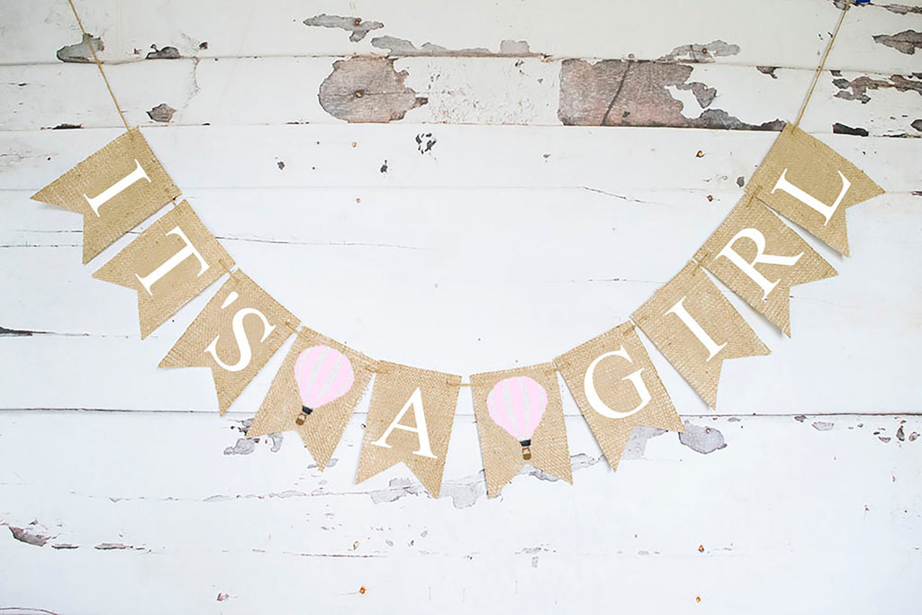 Hot Air Balloon baby shower decoration. Hot air balloon pregnancy announcement. Up, up and away for this baby boy shower banner. Perfect for a hot air balloon theme, this 'it's a girl' burlap banner will look gorgeous at your gender reveal hung above a table.