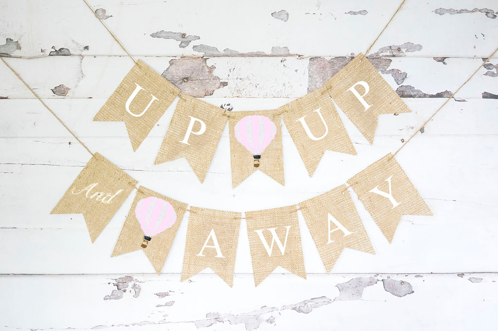 Hot Air balloon birthday party decor. Let your party fly with this gorgeous 'up up and away' banner for your Adventure awaits party decoration. Perfect for a hot air balloon party theme or to hang in a nursery.