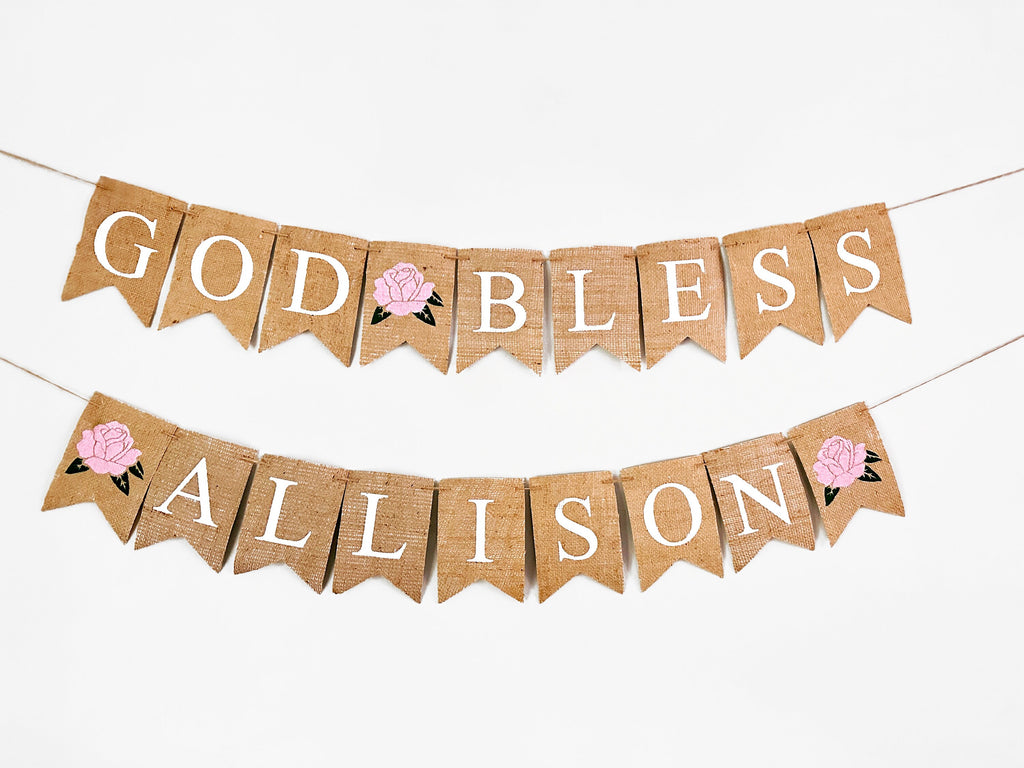 Pink Rose Personalized God Bless Banner | Baptism, Confirmation, or Christening Decorations