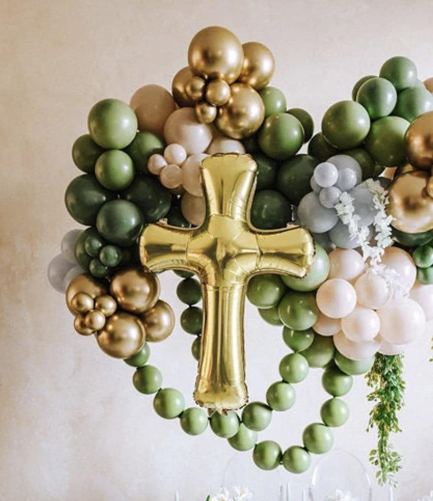 Elevate your Christening Party or Religious Celebration with this elegant Baptism Balloon Collection. Featuring neutral balloon garland tones and a stunning gold cross balloon, this set adds a timeless and sophisticated touch to any religious event. Perfect for baptisms, first communions, and dedications, these religious balloons create a serene and stylish backdrop for your special day.