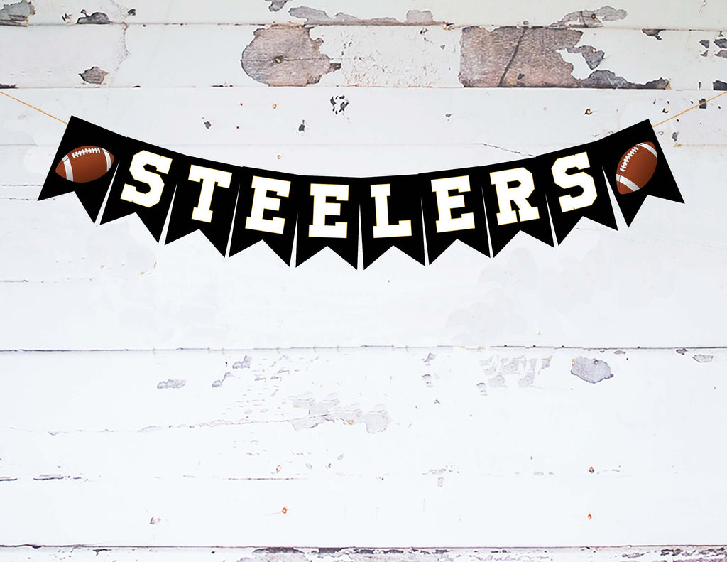 Football Party Decor. It's Game Day, score a touchdown with this Steelers football banner, perfect for your football party. You invite the guests and we'll make the decorations. This cardstock banner with the Steelers colors makes the perfect football decor.