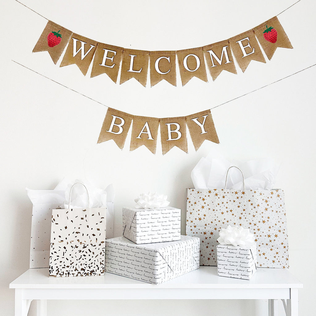 Your berry sweet baby girl deserves her own Strawberry baby shower decoration. Announce your pregnancy with this strawberry themed burlap banner. Great for a summer gender reveal, this cute strawberry banner has a vibrant hand painted strawberry between the words Baby Girl. When the Mommy to be has finished celebrating it can be hung in the baby's nursery as part of her strawberry nursery decoration. Select from our collection of Strawberry baby shower banners which include the following
