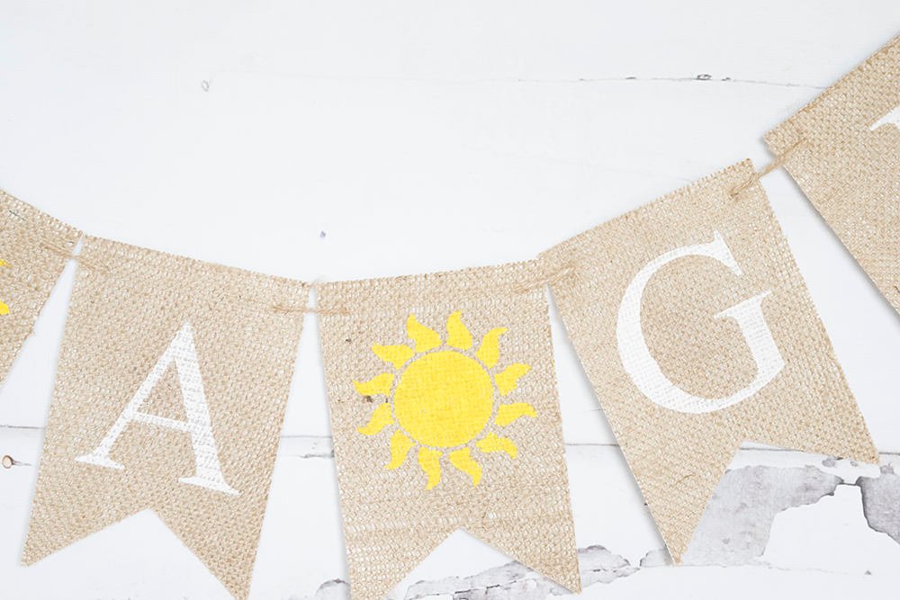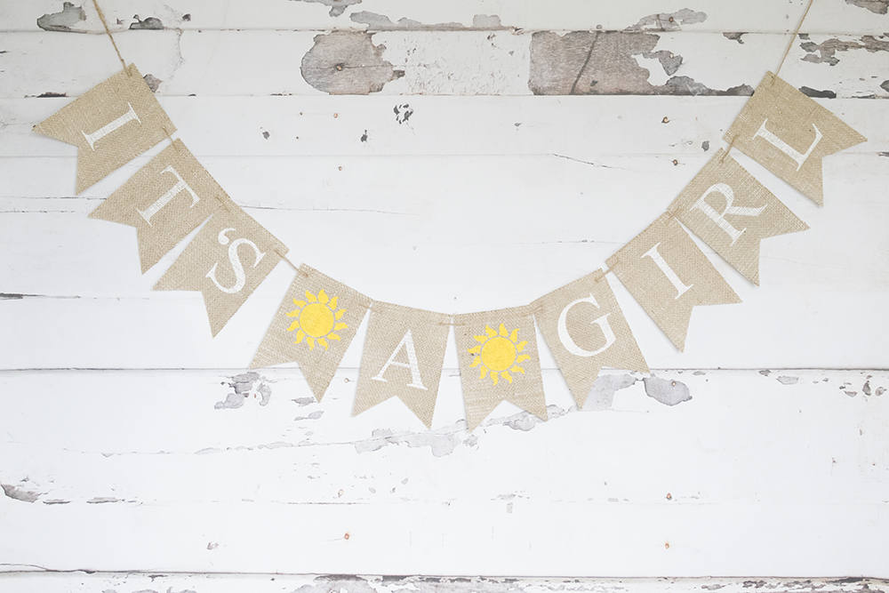 Little Sunshine baby shower decor. This beautiful summer banner announces the gender of your baby. Perfect for a summer baby shower or a sunny pregnancy photoshoot.