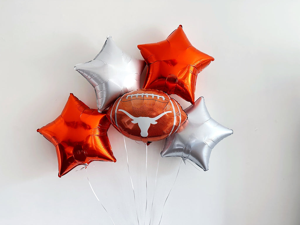 This Texas football balloon bouquet is great for your next football party or graduation celebration! With a team ball and brightly colored star balloons, this set is the perfect addition to your football watch party. Great for decorating for a football birthday party or team party.