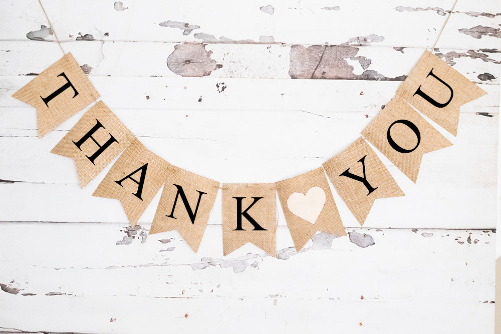 Thank You Sign. Tell all that have helped and supported you how thankful you are with this handmade burlap Thank You Banner. The words Thank You along with a white heart are stenciled onto burlap. Perfect for a graduation party, wedding decor, or any celebration where you want to thank your guests.