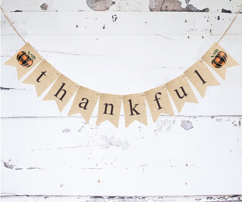 Thanksgiving decor. A wonderful Thanksgiving banner with the words thankful painted in brown with black & orange plaid pumpkins at the ends. Makes the perfect fall or Thanksgiving decoration for a mantel or table.