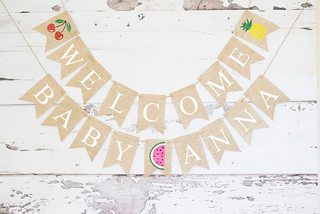 Tutti Frutti Baby Shower Decor, Tutti fruti banner. Welcome your little one with this summer fruit baby shower banner that is perfect for a neutral shower or gender reveal party. The words 'Welcome Baby' are stenciled in white with vibrant fruit painted in between and at the ends. Add your family name or your precious little one's name to this custom banner. Include your personalized wording in the notes when checking out. Count out the letters in your name and then select from the drop-down menu to the right.