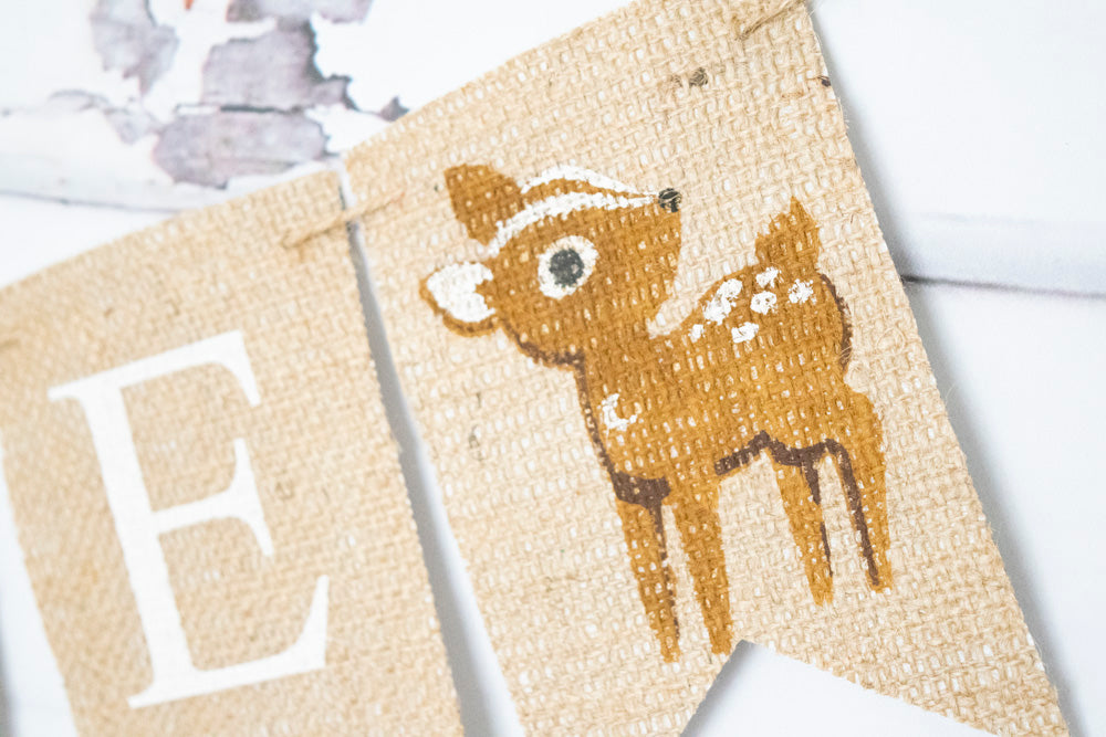 Celebrate your new family member with this gorgeous banner. Perfect for a baby shower or gender reveal party. Stenciled in bright white with adorable baby deer on each end.