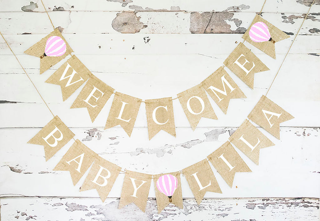 Hot Air Balloon baby shower decor. Up Up and away baby shower decoration. Welcome your little one with this hot air balloon baby shower banner. The words Welcome Baby are stenciled in white with a baby pink and white hot air balloon. Personalize this banner with the name of your choice. Just use the drop-down menu on the right to select the number of letters you will need for the name only.