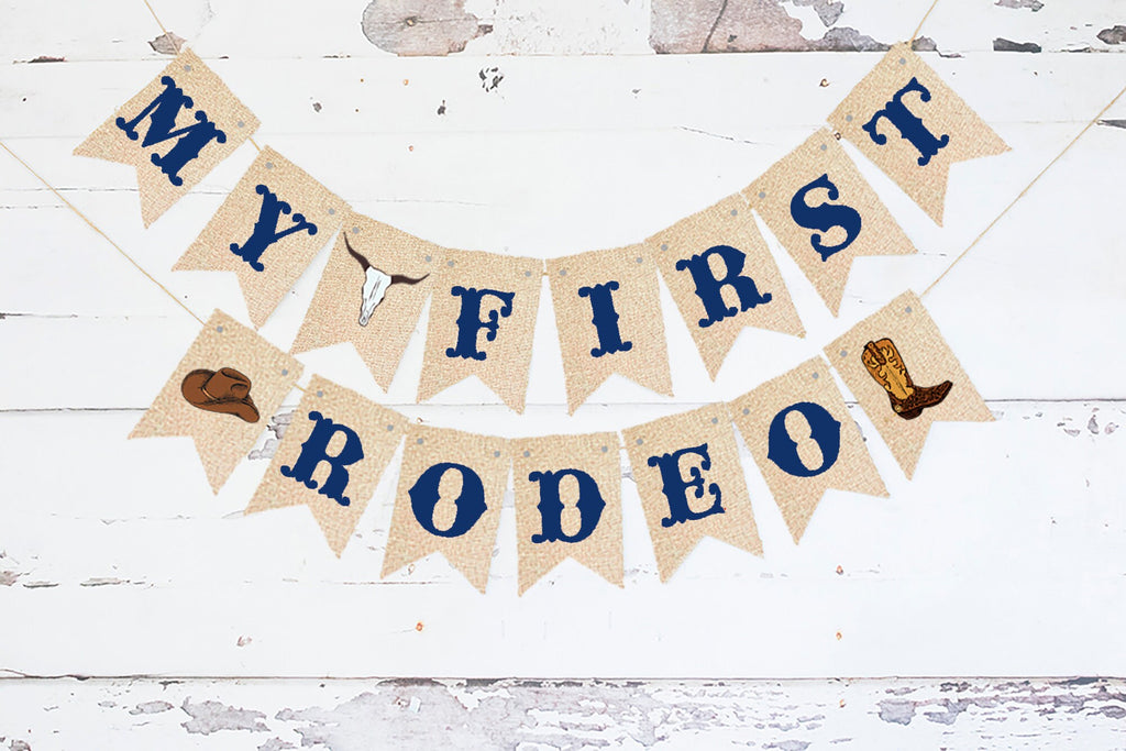 Cowboy first birthday party decor. My first rodeo banner. A fun western party decoration for a little cowboy turning two. The words My first rodeo printed on a simulated burlap background in navy blue, with a longhorn, cowboy hat and cowboy boot as the western themed images on this adorable Western 1st birthday banner.