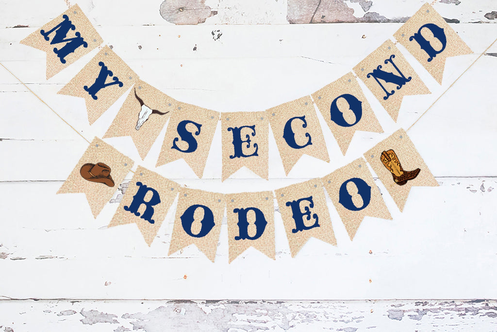 Cowboy second birthday party decor. My second rodeo banner. A fun western party decoration for a little cowboy turning two. The words My second rodeo printed on a simulated burlap background in navy blue, with a longhorn, cowboy hat and cowboy boot as the western themed images on this adorable Western 2nd birthday banner.